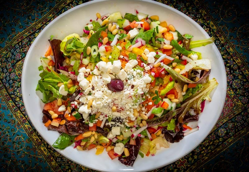 Organic mixed greens, romain, tomatoes, cucumbers, lemon juice and olive oil, topped with feta cheese